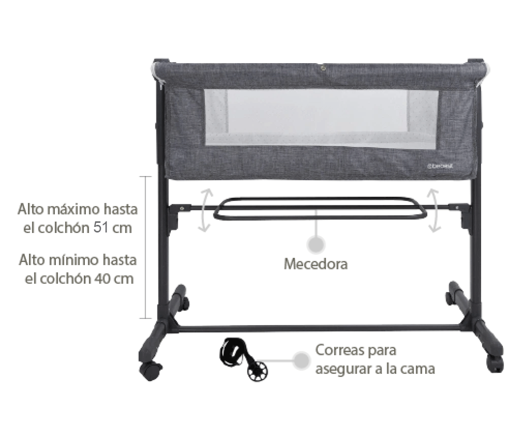 Más Cerquita de tu BebéLa Cuna Colecho My Side te ofrece la versatilidad de usarla como mini cuna independiente o en modo colecho, perfecta para mantener a tu bebé cerca durante la noche. Fabricada en aluminio para ser estable y liviana, es ideal desde el nacimiento hasta los 9 kg. | ![]() |